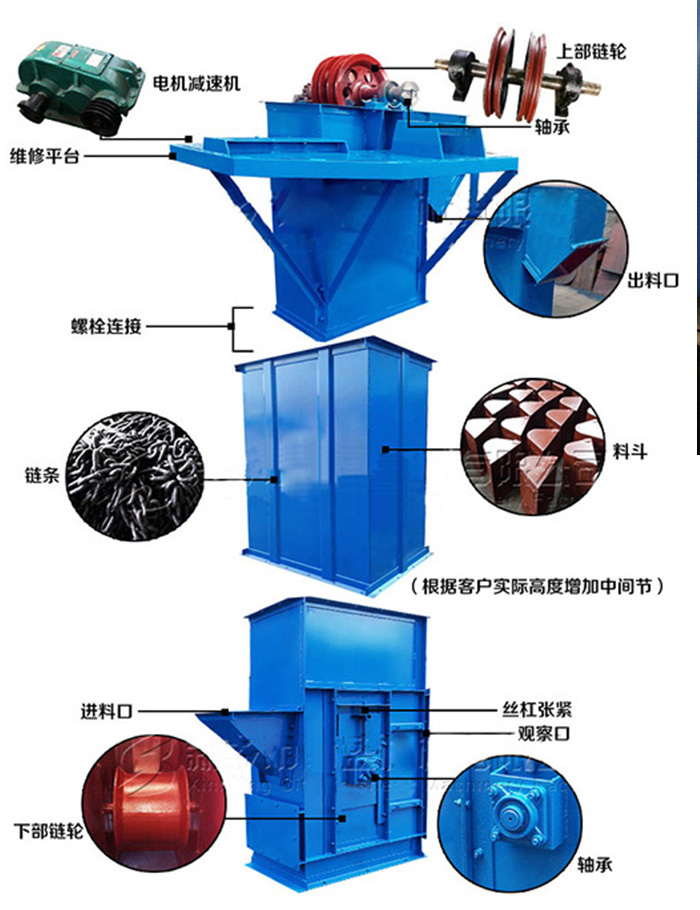 料斗把碎矿石从下面的储藏中舀起,随着输送带或链提升到顶部,绕过顶轮后向下翻转,TD型斗式提升机将物料倾入接受槽内。带传动的TD型斗式提升机的传动带一般采用橡胶带,装在下或上面的转动滚筒和上下面的改向滚筒上。链传动的斗式提升机一般装有两条平行的传动链,上或下面有一对传动链轮,下或上面是一对改向链轮。斗式提升机一般都装有机壳,以防止斗式提升机中粉尘飞扬。