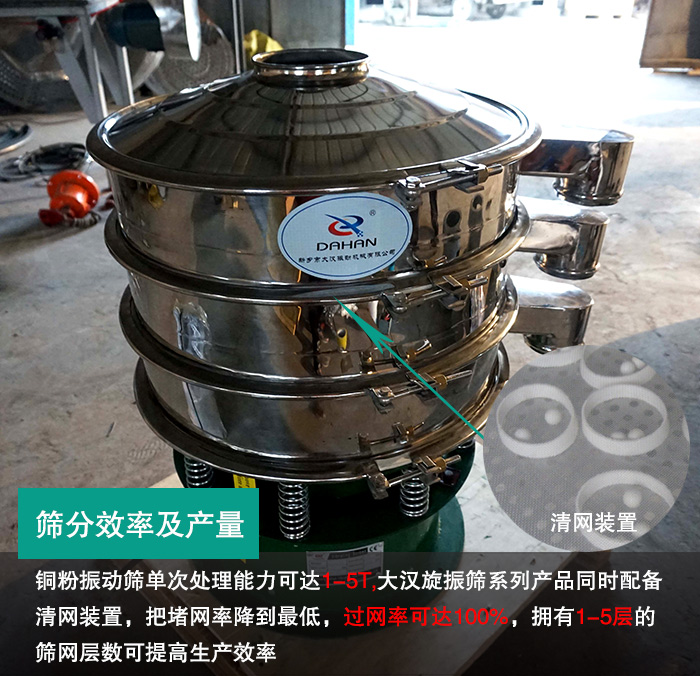 铜粉振动筛单次处理能力可达1-5T,大汉旋振筛系列产品同时配备清网装置,把堵网率降到低,过网率可达100%,拥有1-5层的筛网层数可提高生产效率,因此产量上也会相应增大,铜粉振动筛筛分效率越高,产量越大,机型配置越高,价格就会比普通型的有所差异,然而就造成了价格的不一
