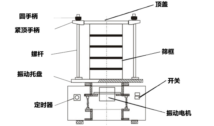 试验筛机以立式振动电机作为整机振动源,通过振动电机带动上部振动盘振动,再通过振动盘传导至安放在振动盘上部的筛框上,然后由需要检测目数的筛框把小于筛网孔径的物料颗粒筛分至下层筛框,如此层层筛选,使每层试验筛内只留相同粒度的物料,达到不同粒度的分离并确定此物料的粒度组成,使筛框中的物料能非常有效的起到过滤、分级、筛分目的。